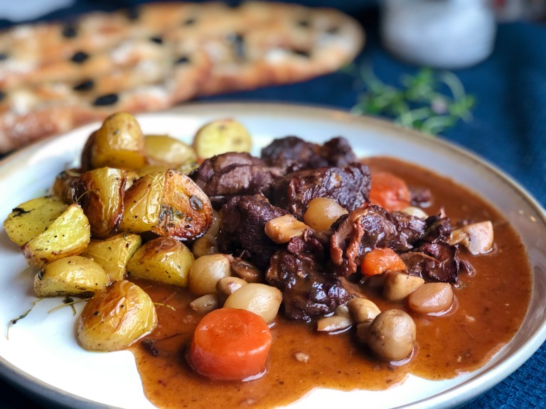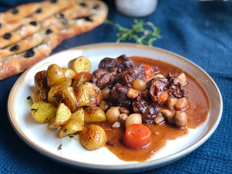 Server boeuf bourguignon med ovnsbakte småpoteter og godt brød.