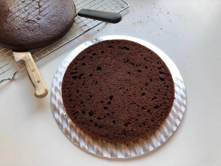 Del kakebunnen i to og smør godt med frosting på bunnen, legg overdelen