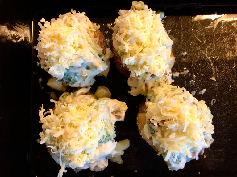 Sett potetene tilbake i ovnen, sett på grill og stek til osten har blitt gyllen brun.