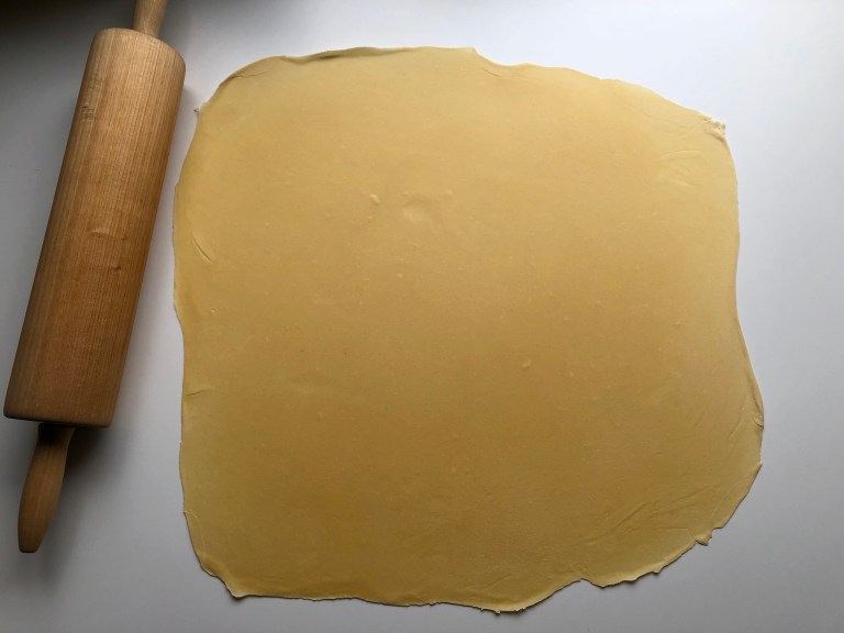 Kjevle ut deigen til den er avlang og flat, så tynn som mulig.