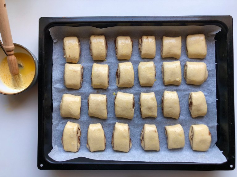 Smør fyllet utover. Skjær deigen i to så du får 2 avlange deler.