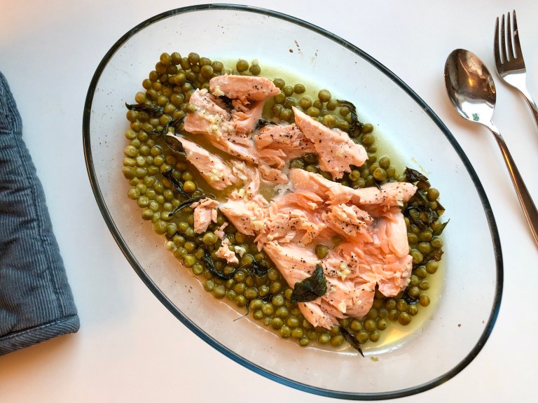 Vend det raskt og forsiktig inn i sausen sammen med laksen og ertene.