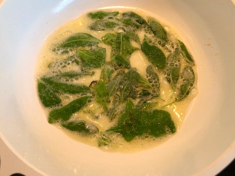 Smelt smør i en godt varm stekepanne og fres salviebladene i 30 sekunder.
