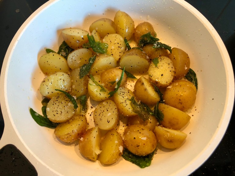 Kutt potetene i to med skallet på.