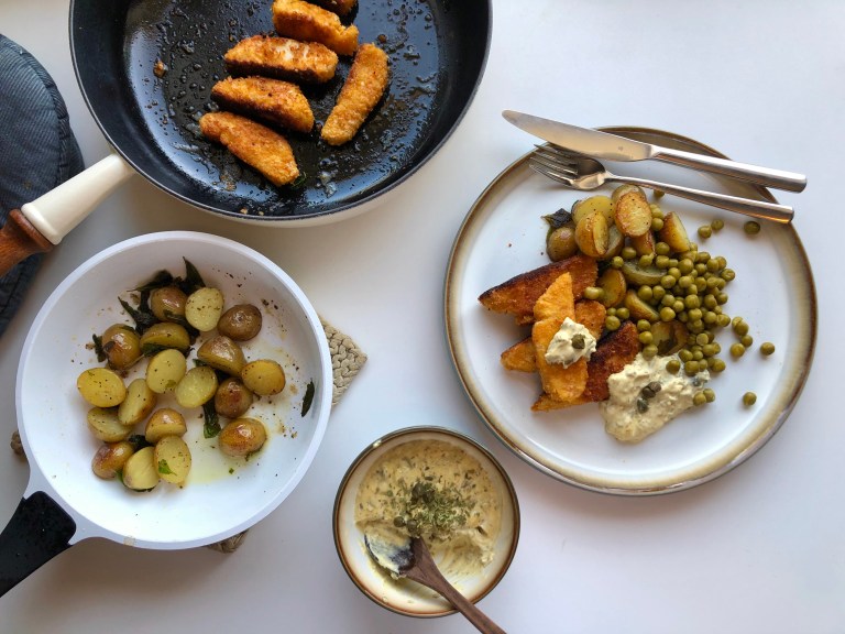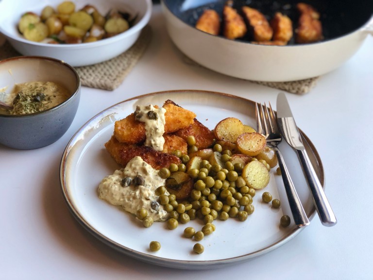 Server varme fiskepinner med hjemmelaget remulade, salviepoteter og erter.