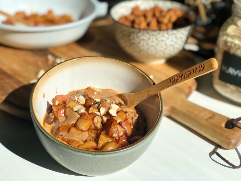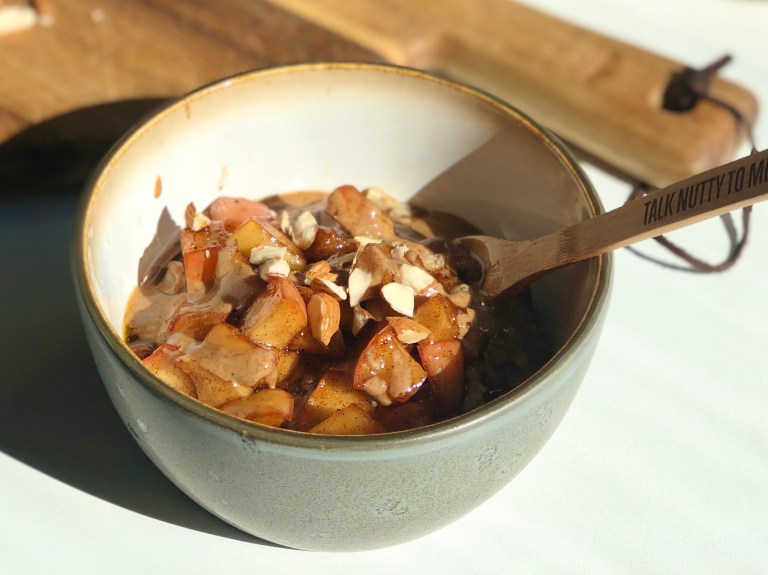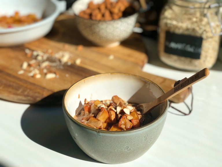 Ha grøten i en bolle, legg på karamellisert eple, mandelsmør og ristede mandler.