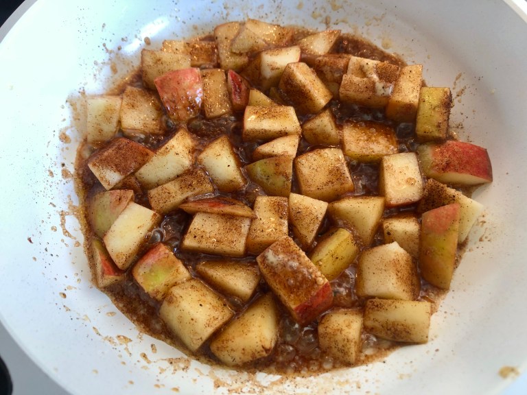 Tilsett eplebiter og la det steke til eplebitene er møre.
