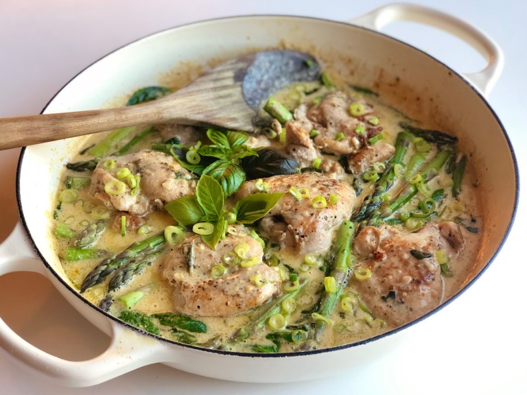 Legg også kyllingen ned i sausen og sett hele pannen inn midt i ovnen.