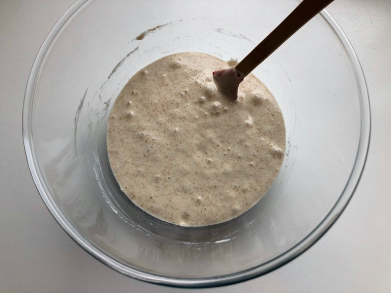 Ha surdeigsstarter i en bakebolle og rør inn vann, lønnesirup, mel og salt godt.