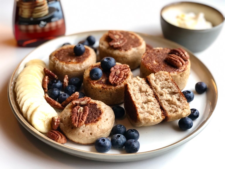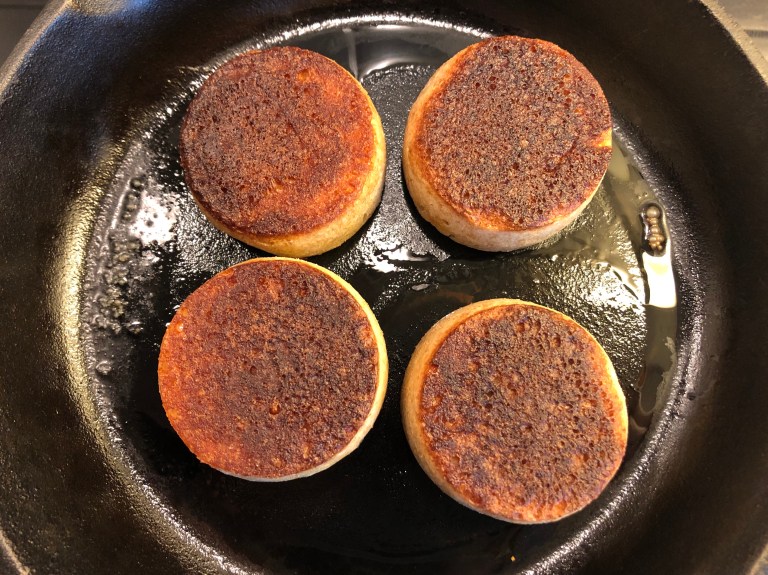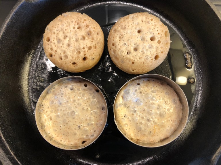 Sourdough crumpets, surdeigs-crumpets, eller små surdeigsbrød.