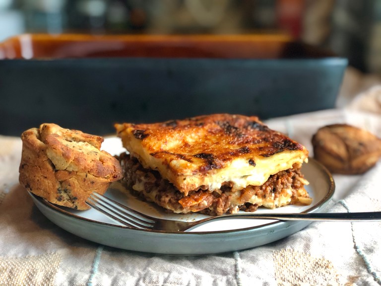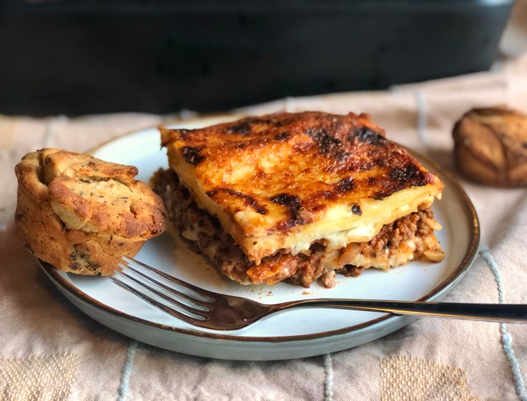 Smør en ildfast form og start med et lag med kjøttsaus i bunnen.