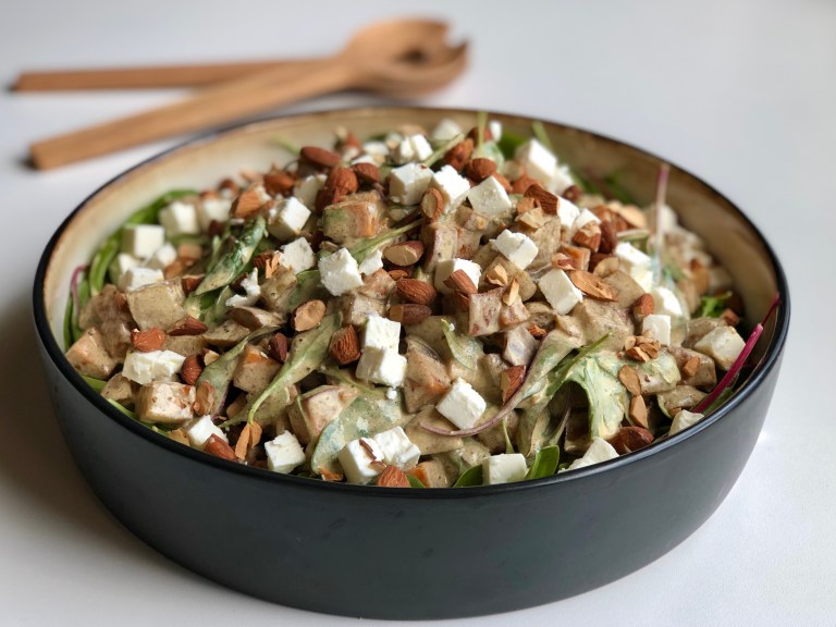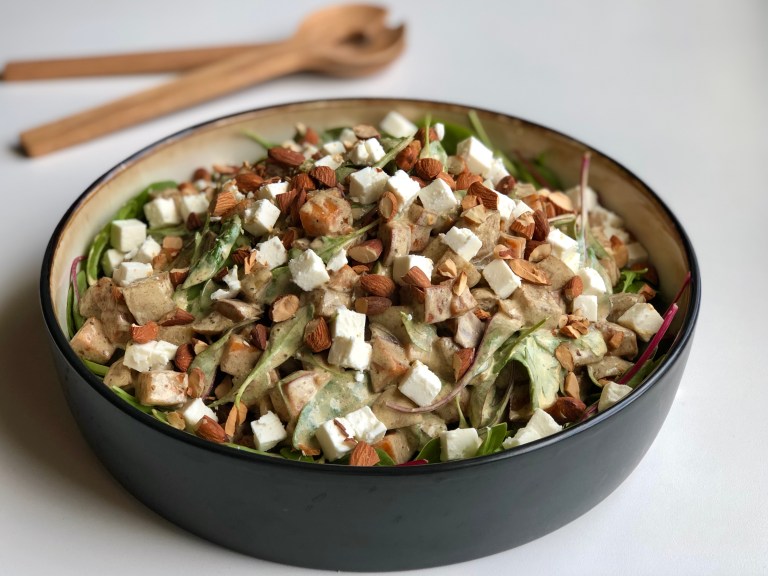 Strø over fetaost i terninger og hakkede ristede mandler og server.