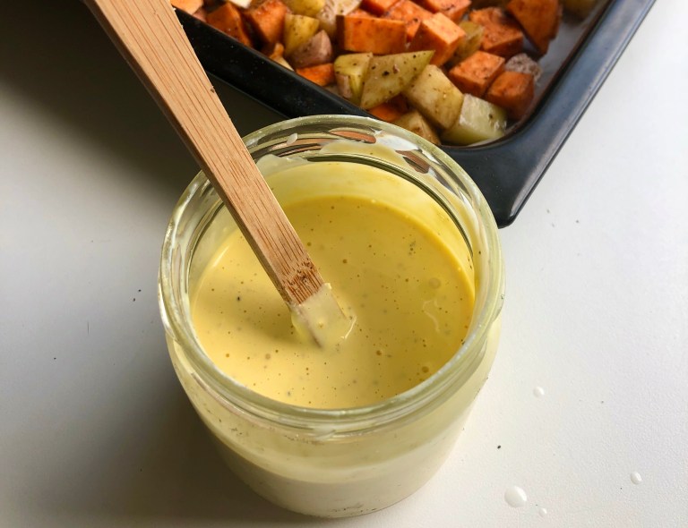 Rør sammen yoghurt, aioli, sitronsaft og honning og smak til med salt og pepper.