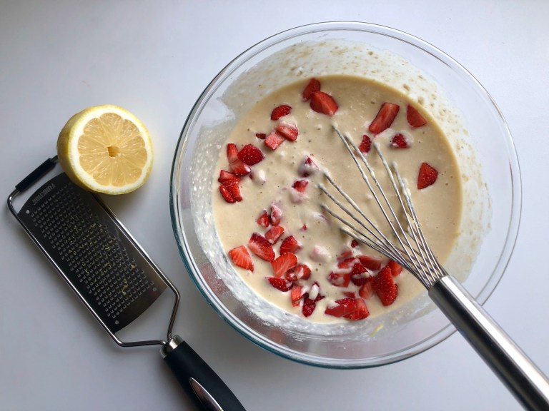 Pisk inn eggene og tilsett mandelmelk (eller vanlig melk), sitronsaft, sitronskall,