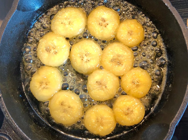 Stek noen skiver banan i en annen stekepanne med litt smør og flytende honning.