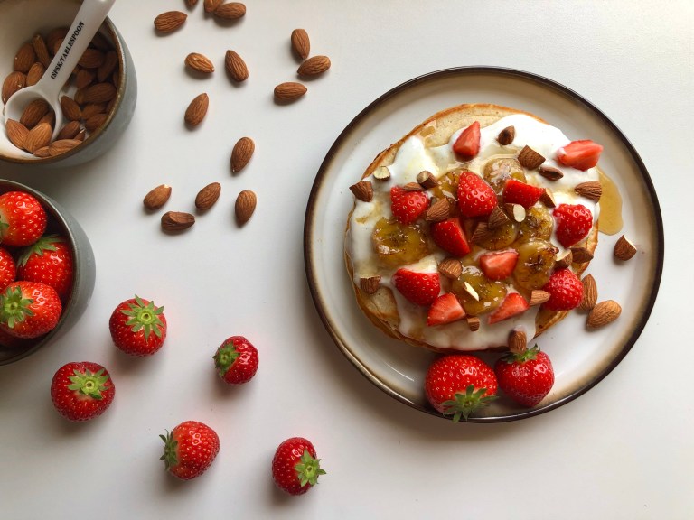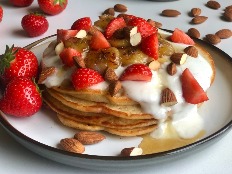 Pannekakene toppes med vaniljeyoghurt, stekt banan, jordbær og ristede mandler.