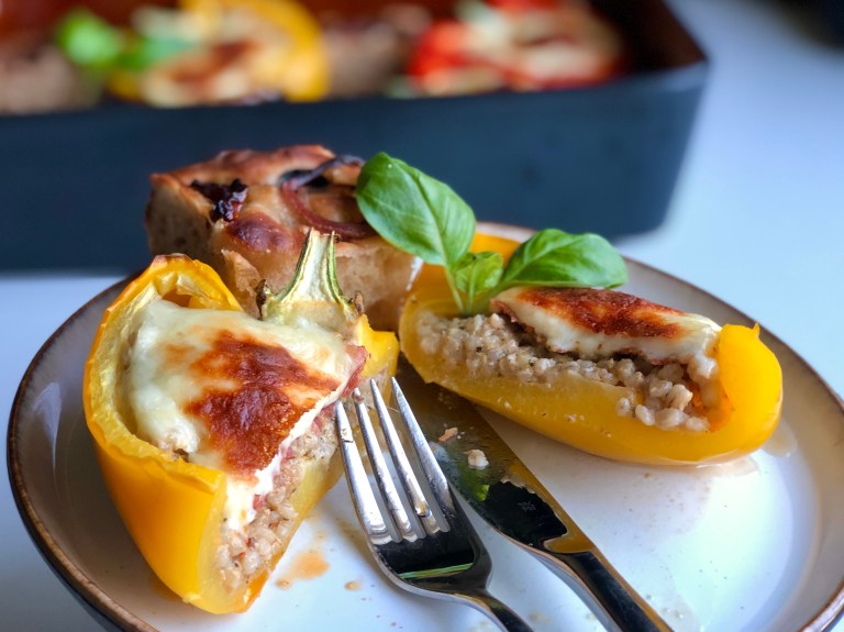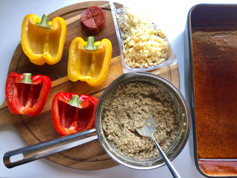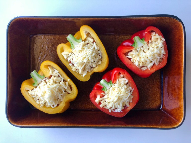 Fyll de med byggryn/brokkolipesto, pepperoni over og topp med mozzarella.