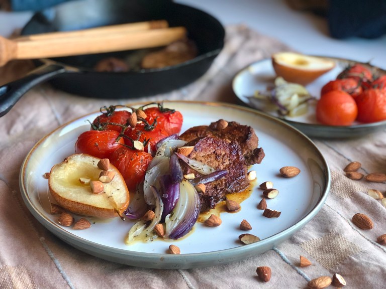 Server biffen med tilbehør og hakkede ristede mandler og nyt!