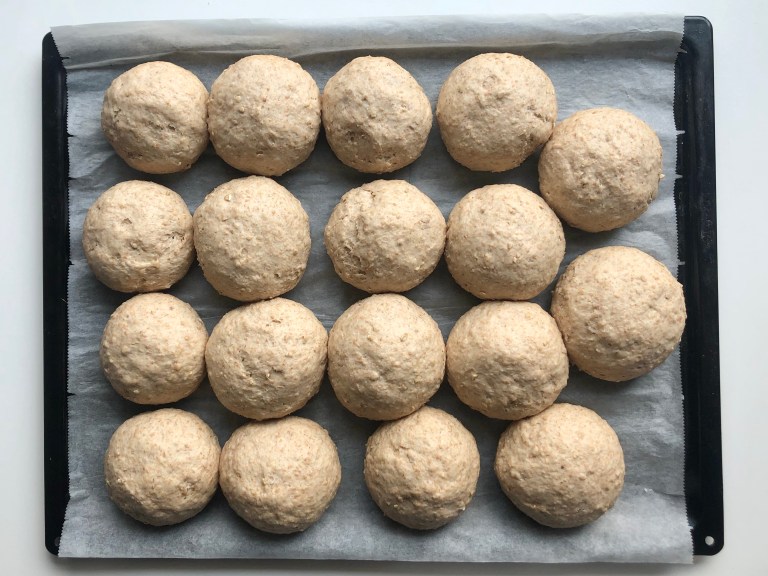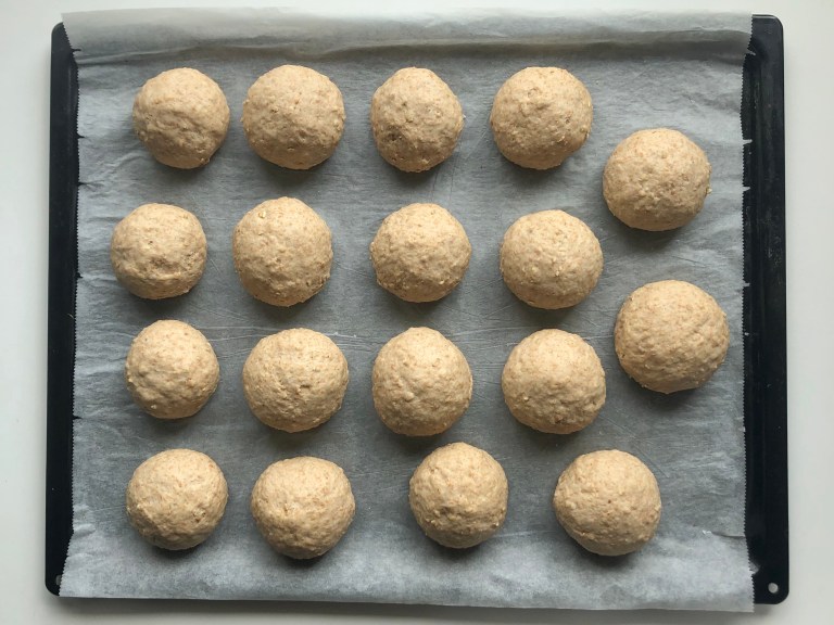 Sett de på et bakepapirkledt stekebrett med lite mellomrom.