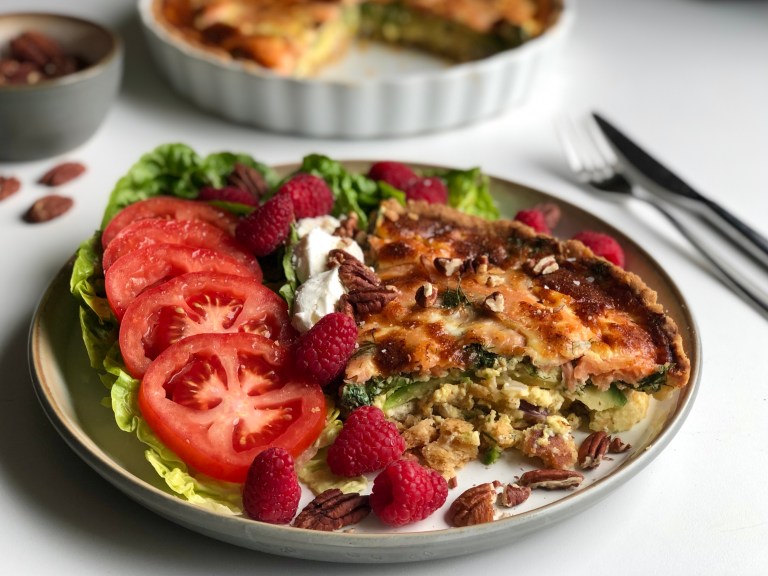 Trykk deigen utover i bunnen og helt opp til kanten. Bruk en paiform på ca. 26 cm.