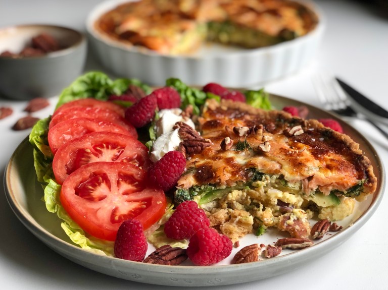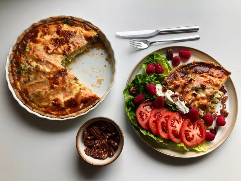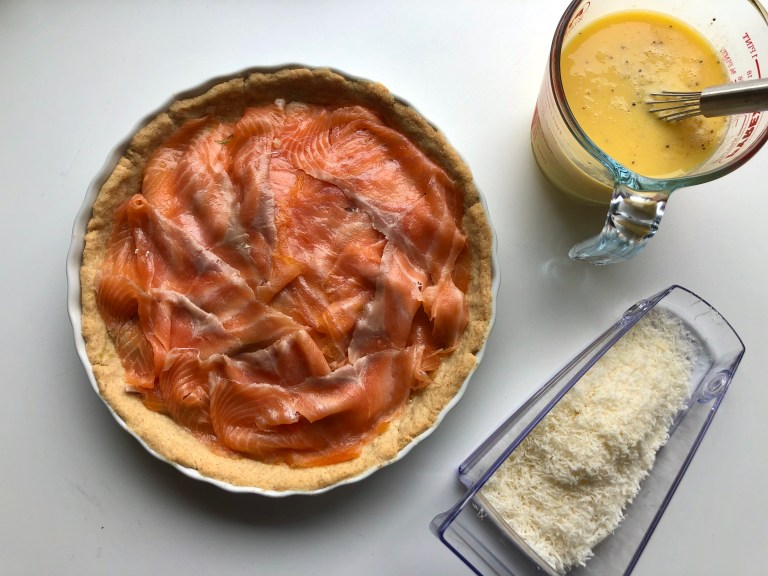 Hell over omtrent halvparten av egg/melkblandingen og legg på laksen.