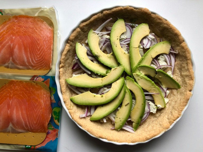 Fordel rødløk og avokado i strimler over, strø over finhakket dill.