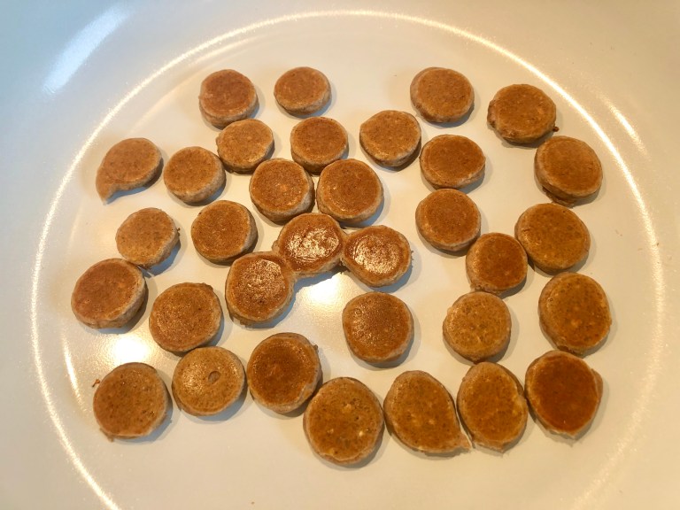 Varm en stekepanne til middels varme og legg små klatter røre rundt i hele pannen.