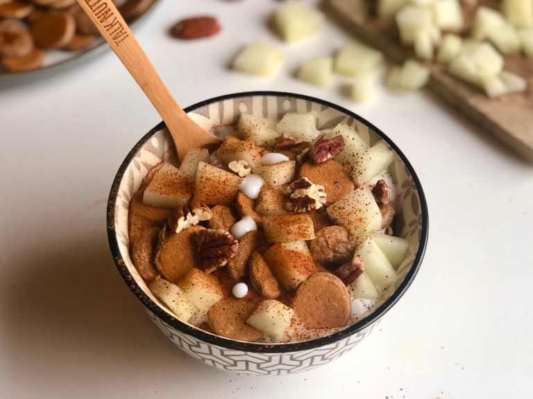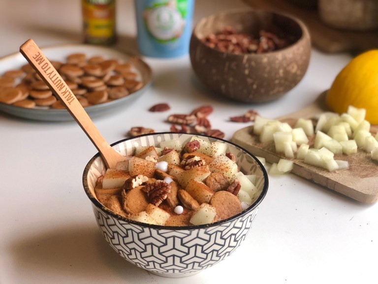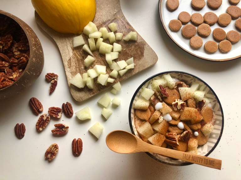 Ha de små lappene i en skål, ha på yoghurt, et dryss kanel,