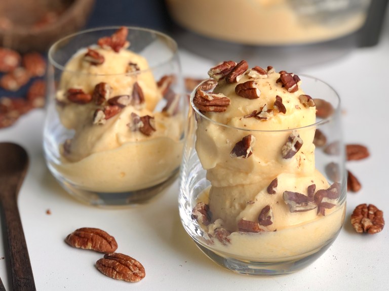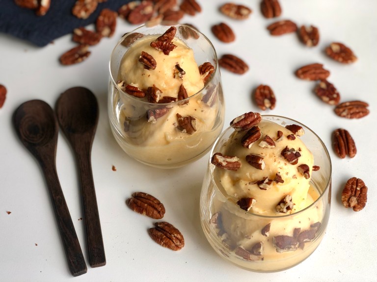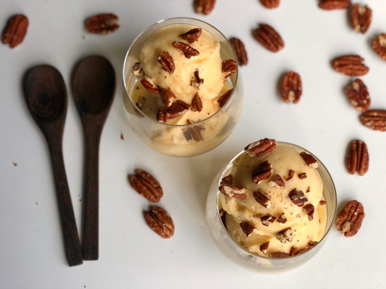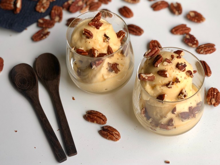 Hell det over i en skål eller lag kuler og legg på ristede pekannøtter.