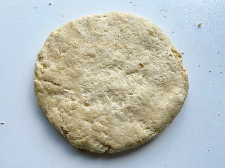 Klem deigen sammen igjen og form den rund og 2-3 cm høy.