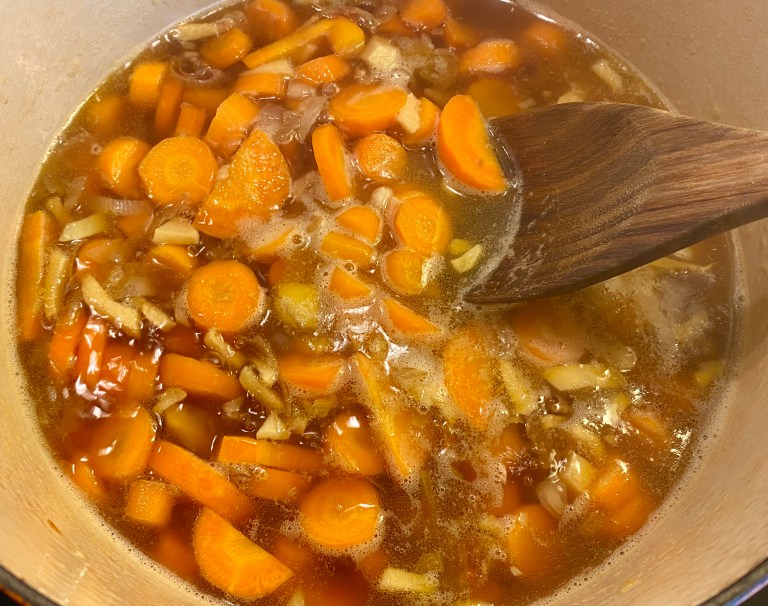 Når gulrøttene er helt møre bruker du en stavmikser og kjører suppen klumpfri.