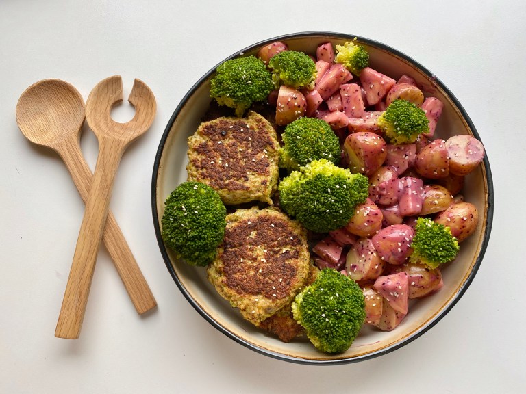 De er servert med en nydelig frisk potetsalat og dampet brokkoli!