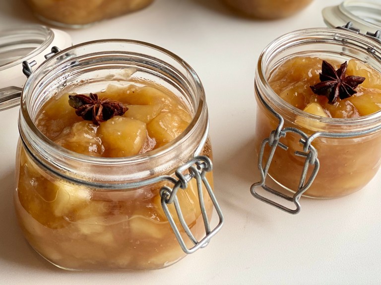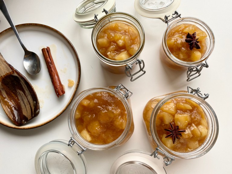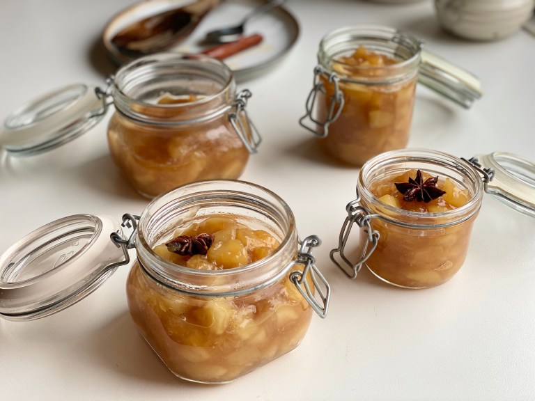 Ta ut kanelstengene og stjerneanis og ha eplesyltetøyet over i glass med lokk.