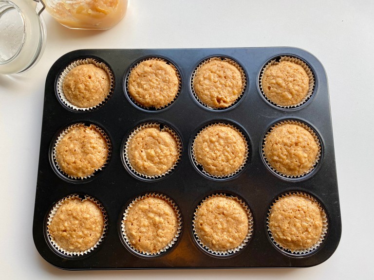 Ha muffinsformer i et 12 forms muffinsbrett og fordel røren i.