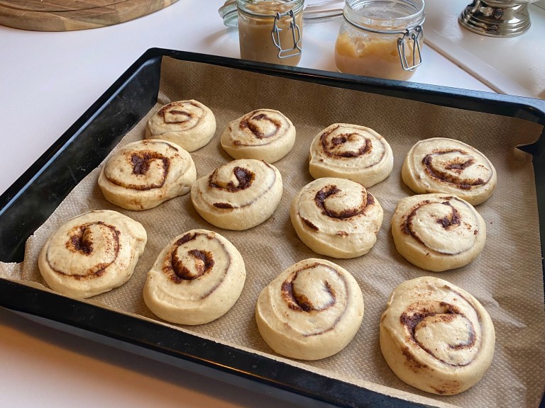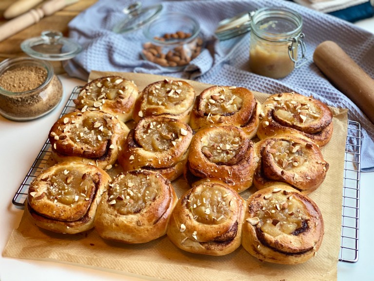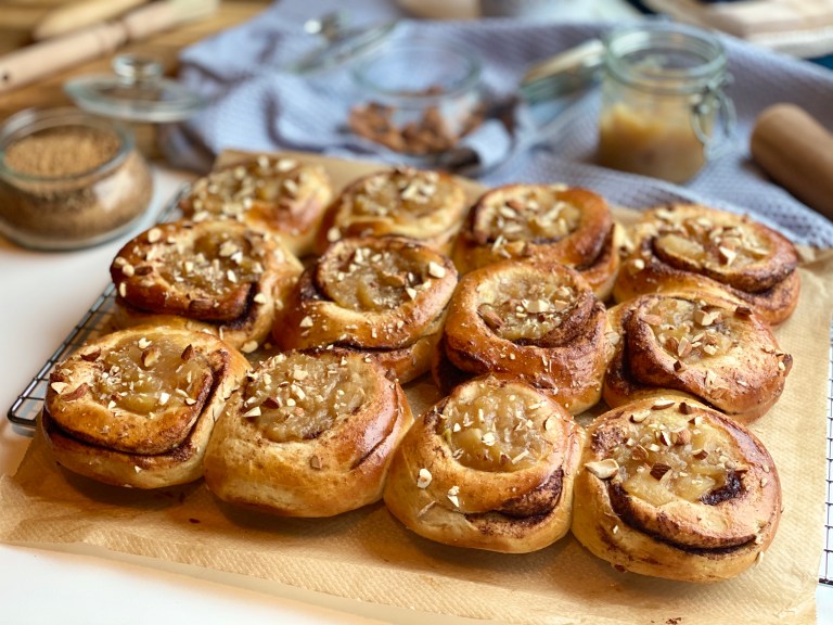 Luftige og saftige kanelsnurrer med hjemmelaget eplesyltetøy.