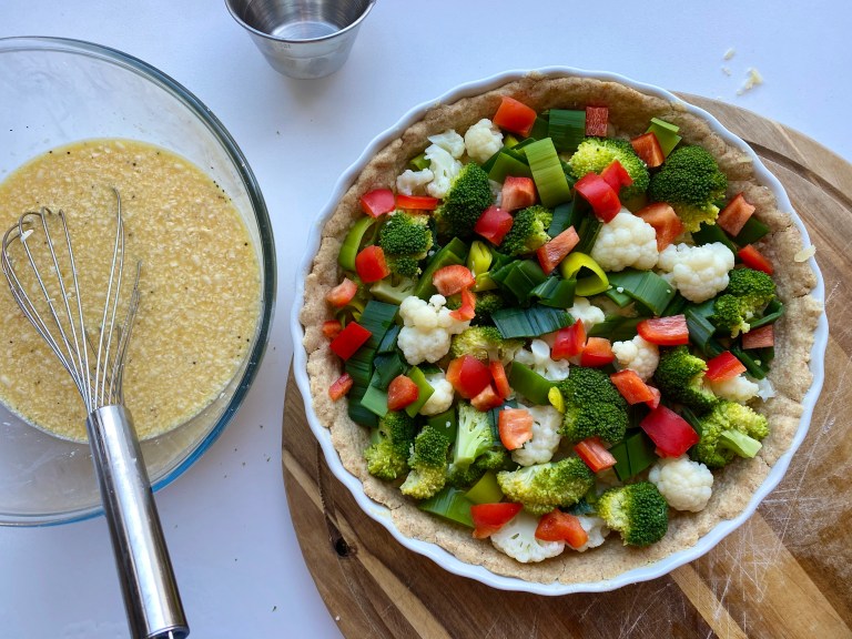 Fordel blomkål, brokkoli, purre og paprika over og strø over en klype maldonsalt.