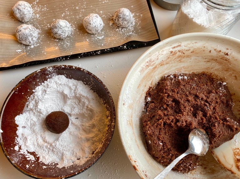 Rull ballene i melisen i skålen og legg de over på et bakepapirkledt stekebrett.