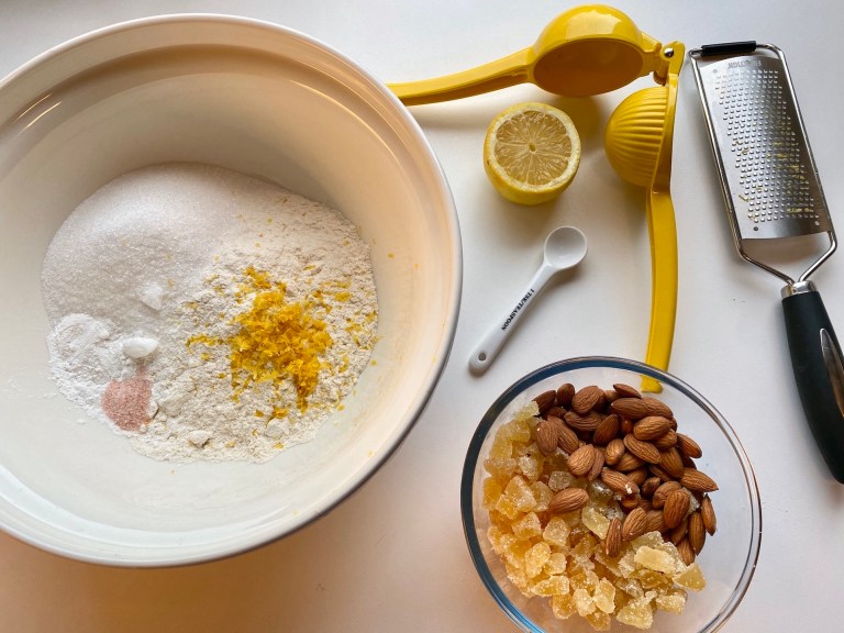 I en bakebolle blander du sammen mel, sukker, bakepulver, salt og sitronskall.