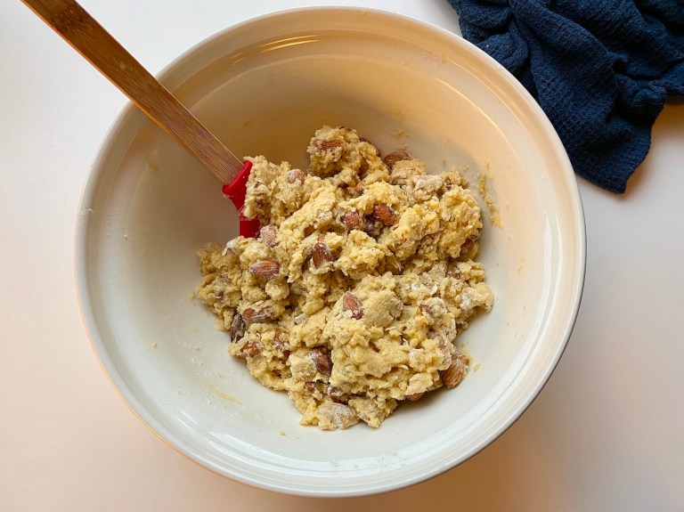 Vend inn mandlene og kandisert ingefær i små terninger, ca. 1/2 x 1/2 cm.