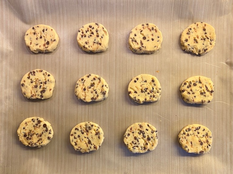 Ta deigen ut av kjøleskapet og del den i 24 like store biter, ca. 1/2 cm tykke.