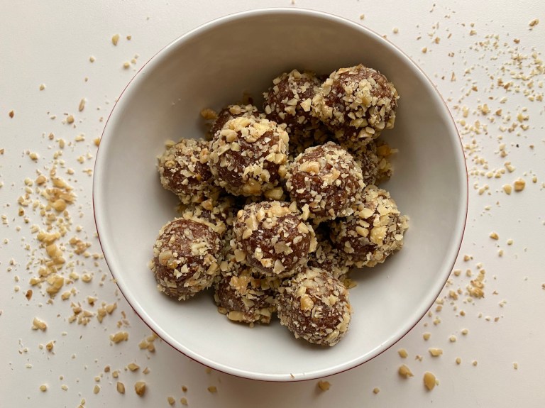 Finhakk resten av valnøttene og ha det i en skål og rull kulene i det til slutt.