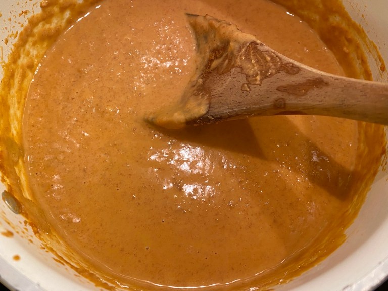 Hell over peanøttsausen, sett på lokk og la det putre i 3-4 minutter.