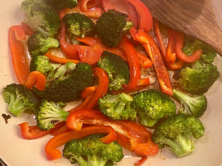 Stek brokkolibuketter og paprikastrimler i litt olje i en middels varm stekepanne