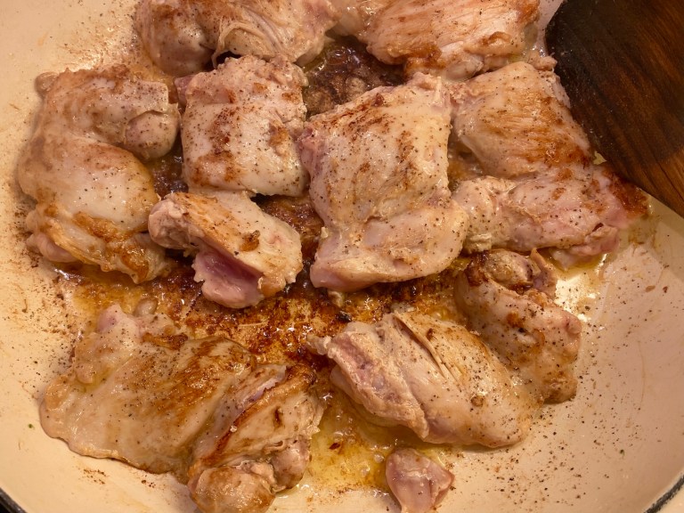 Stek kyllinglårene i 2 minutter på hver side, i samme panne, på middels høy varme.