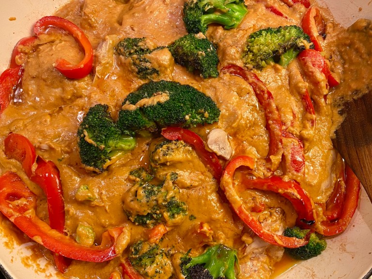Stek kyllinglår, brokkoli og paprika og hell over peanøttsausen.