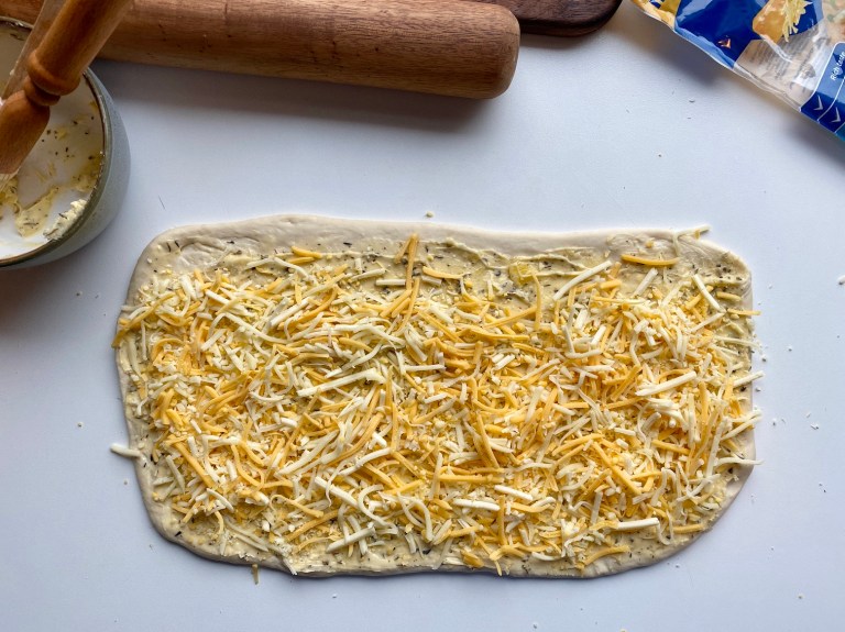 Smør utover nesten alt hvitløkssmøret og strø over mozzarella og cheddar.