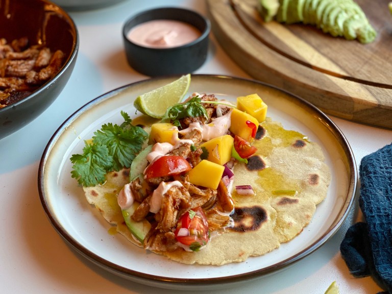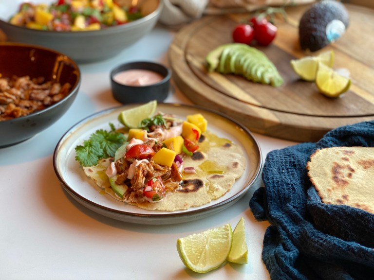 Server lunkne tortillas med mangosalsa, avokado, limebåter,