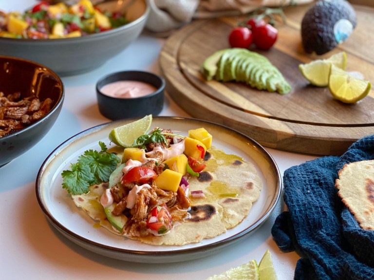Server lunkne tortillas med mangosalsa, avokado, limebåter,