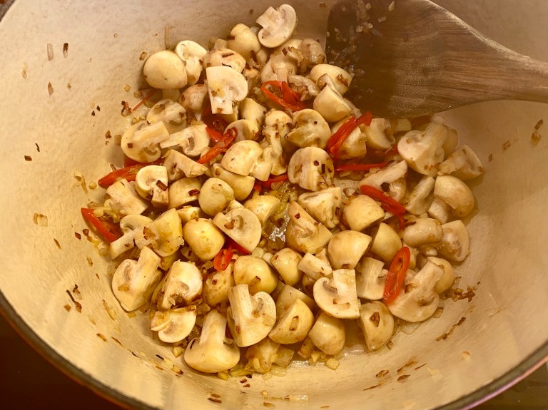 Kutt sjampinjong i 4 så du får båter og la det steke med i 3-4 minutter.