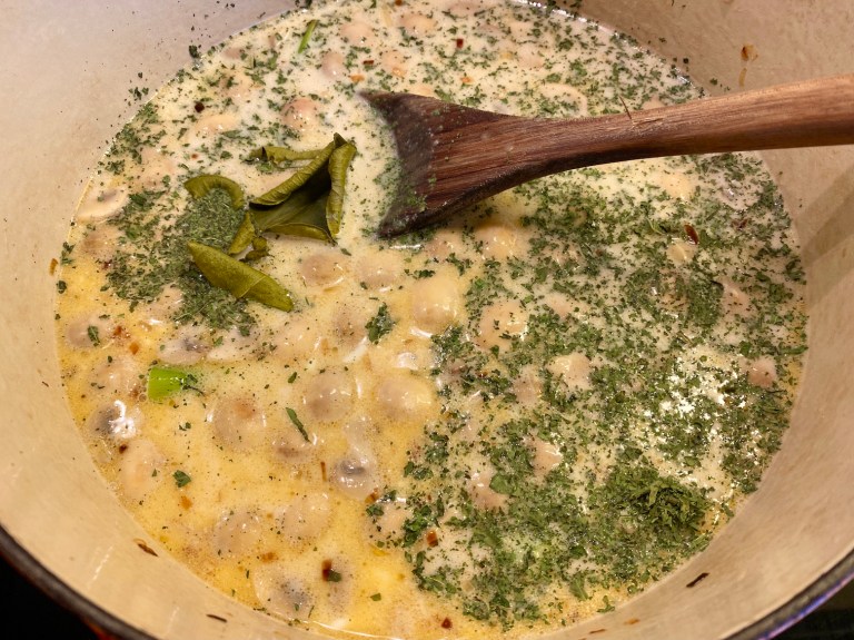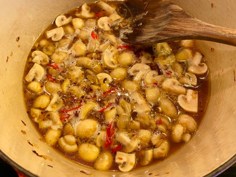 Ha i all kokosmelken og mens du varmer det sakte opp til kokepunktet….